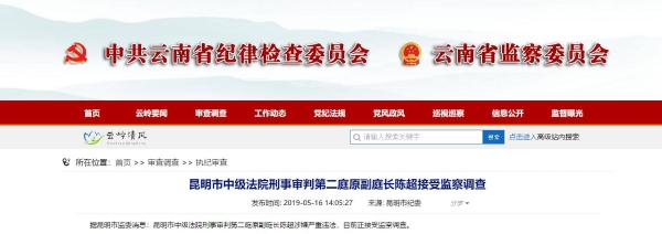 昆明信息港讯 据昆明市监委消息:昆明市中级法院刑事审判第二庭原副庭长陈超涉嫌严重违法,目前正接受监察调查。