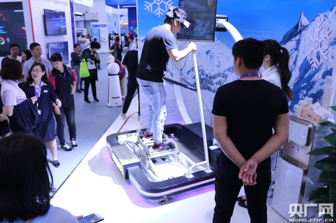 市民体验VR滑雪,在展区内市民可以佩戴眼镜亲身感受仿佛在赛道滑雪,这种体感游戏已经逐步普及。(央广网记者 刘阳 摄)