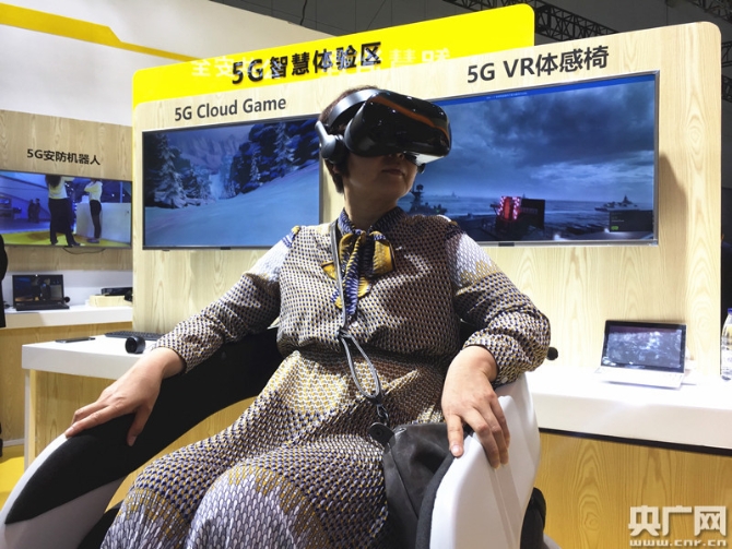 戴上VR眼镜,观众在5GVR体感椅上进行体验。体感椅能够模拟车船,通过震动、摇摆等方式让坐在椅子上的观众有身临其境之感,目前体感椅主要在部分影院、科技馆投放。(央广网记者褚夫晴 摄)