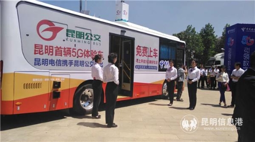 活动现场由中国电信昆明分公司(以下简称“昆明电信”)携手昆明公交集团公司打造的云南省首辆5G智慧公交车使人眼前一亮,该公交车安装有中国电信5G接收模块。车内对5G智慧应用进行了集中展示,包括VR/AR直播、无人飞机、水质监测、智能制造、人脸识别、智慧安检、远程VR虚拟会议、数字城市沙盘、5G网络4K高清电视、机器人导览、一部手机游云南等11项基于5G网络的新型智慧应用。