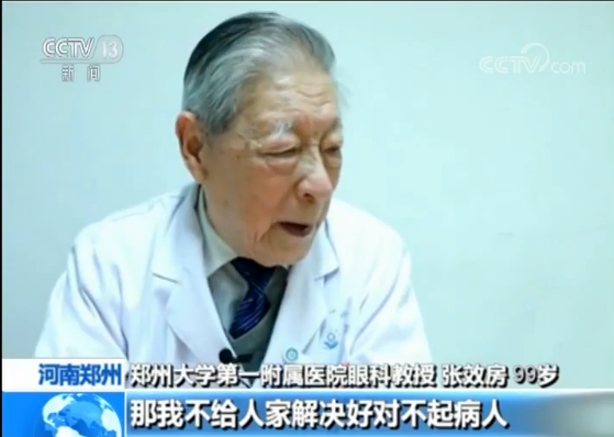 在郑州大学第一附属医院,有一位国内著名的眼科专家,名叫张效房,他是我国眼内异物研究的奠基人和眼外伤专业的学术带头人,今年已经是99岁了。70年来,他让无数患者重见光明,培养了大量的眼科学临床人才,直到如今近百岁高龄,他依然坚持在临床一线。用张效房的话说:活着就要为国家做出贡献。