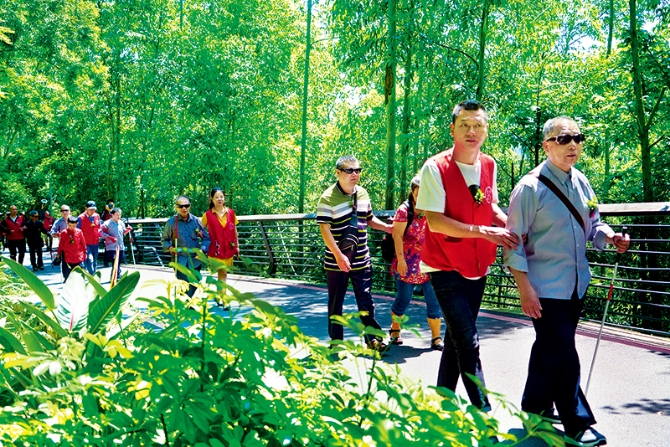 为了在全社会树立奉献、友爱、互助、进步的时代新风,在党中央的亲切关怀下,共青团发起青年志愿者行动,得到广大青年的积极响应,志愿服务成为新的社会风尚。图为2019年5月3日,福州青年志愿者引导视障者在郊野公园步行,感受鸟语花香。 新华社记者 林善传/摄