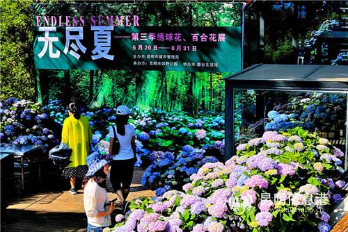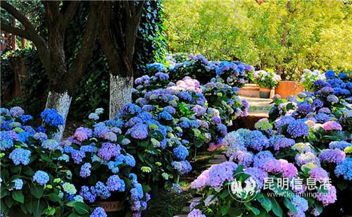 昆明信息港讯 记者杨雁 炎炎夏日,需要一抹清凉、多彩和浪漫的气息。昆明郊野公园林荫下,已被大量蓝色、白色花球包围,一团团、一簇簇的绣球花引来众多游客纷纷赏花拍照。5月20日,昆明市郊野公园第三届百合绣球花展正式启幕,花期持续至8月31日,为市民及游客在盛夏营造一个浪漫的野趣森林。