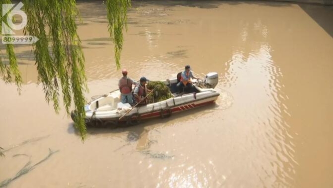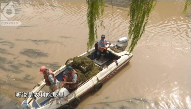 20日中午,在盘龙江圆通大桥附近,记者看到,河道内的水流确实比较浑浊,泛着土黄色,水草裸露,水流也没有之前那么顺畅。有几名河道保洁员正在打捞水草……