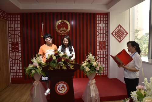 当天,来到盘龙区政务服务中心的一对对情侣喜笑颜开,整个大厅洋溢着幸福的气氛。工作人员为新人们取号、审核证件、指导正确填表、打印证件、颁发结婚证。最幸福的场景在婚姻颁证厅上演,新人们耐心地排队等候宣誓、颁发结婚证,在庄严的国旗、国徽下宣读《结婚誓言》,共同许下相伴今生的约定。