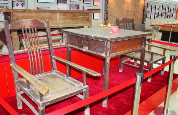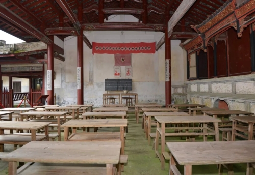 古田会议会场的陈设非常简单,两张八仙桌拼在一起就是讲台,几排长条凳摆放整齐就是坐席。