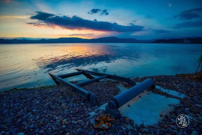 傍晚时分,落日的余晖在水平面上洒下金辉,绯色的彩霞悄无声息地染红了湖水。