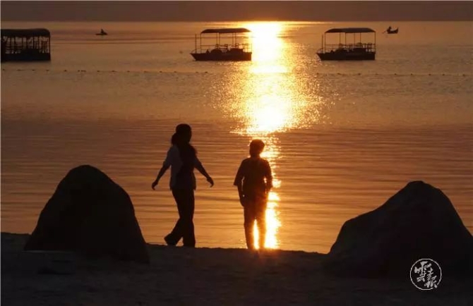 “日出江花红胜火”,每逢日出时分,那绯红的彩霞倒影在湖面上,层层碧波更是妩媚动人,意境深远。