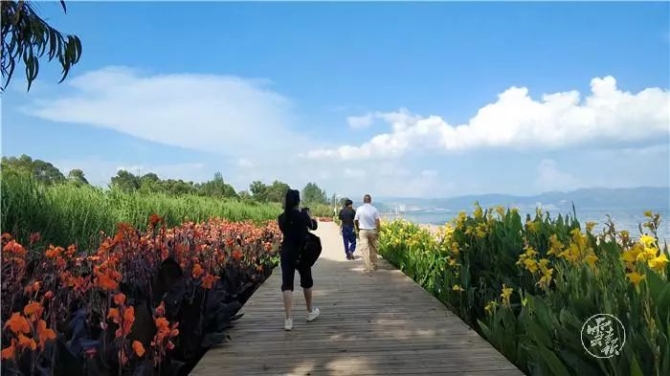 时光栈道是环抚仙湖北岸的一条生态观光走廊,西起尖山小学,东至海口大石洞,全长约28公里,宽3米。沿途可穿过抚仙湖北岸生态湿地、林海公园、月亮湾湿地、樱花谷等地,尽显抚仙湖碧海、蓝天的优美人文景观。