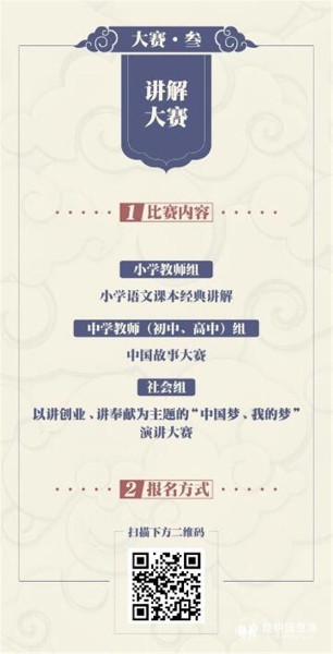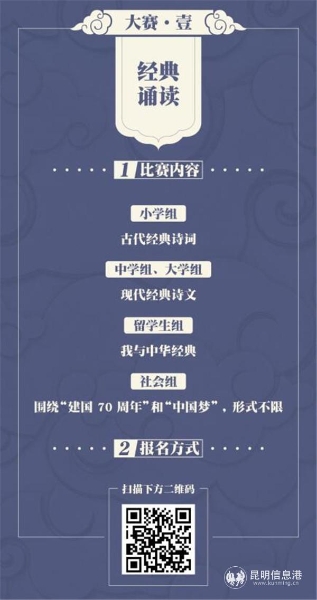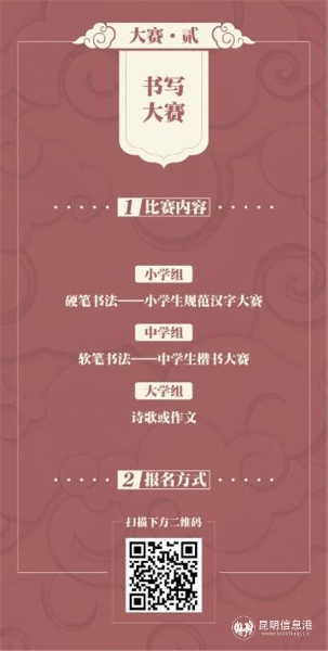 昆明信息港讯 记者马文焘 近日,记者从“云岭杯”云南省2019年中华经典诵写讲大赛组委会了解到,大赛将于5月31日结束经典诵读大赛与经典课讲解大赛两项赛事的海选,而书写大赛的自主报名参赛阶段也同时将在5月31日截止。目前,大赛报名已经进入倒计时阶段,大赛组委会特别提醒还未进行报名参赛的老师、学生和社会人员,抓紧时间报名参赛。