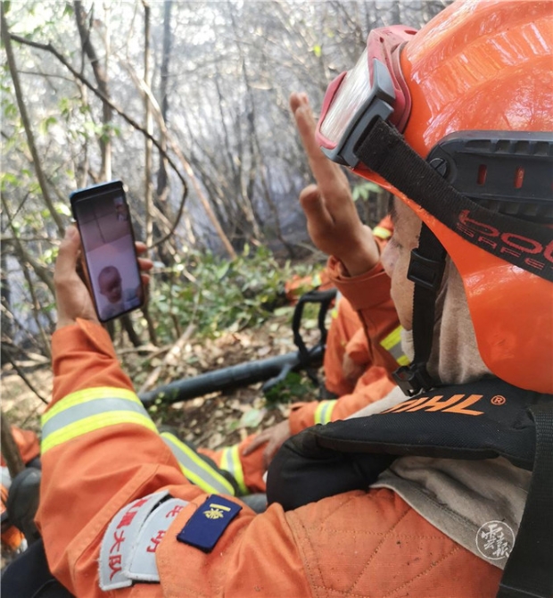 5月18日上午10时,在火场值守的直属大队班长周建华收到一条微信视频邀请。“终于有信号了,严重吗,什么时候能回来?”妻子一连串的追问,让周建华鼻子一酸,低下了头。后来才得知,周建华一岁多的孩子生病了,他原本打算结束安宁灭火任务后回家看望孩子,没想到还没离开营区就又出动了。在晋宁灭火期间,周建华手机一直没有信号,和家人基本处于“失联”状态。