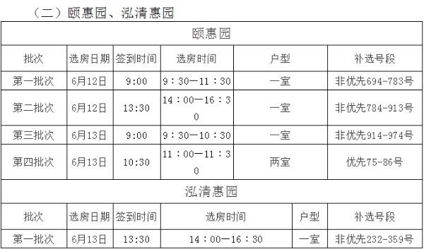 颐惠园项目一室非优先组694-974号,两室优先组75-86号,以及泓清惠园项目一室非优先组232-359号,可于6月10日至6月11日上午9:00-12:00、下午13:30-16:30,将材料提交至西山区望江路泽惠园小区1栋管理服务大厅,咨询电话:0871-64602630。