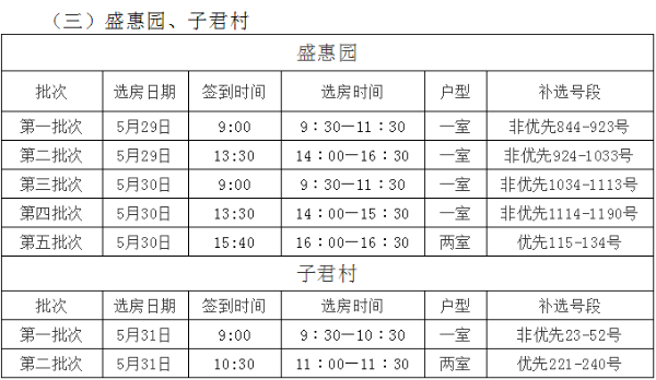 盛惠园项目一室非优先组844-1190号,两室优先组115-134号,以及子君村项目一室非优先组23-52号,两室优先组221-240号,可于5月27日至5月28日午9:00-12:00、下午13:30-16:30,将材料提交至西山区望江路泽惠园小区1栋管理服务大厅,咨询电话:0871-64602630。