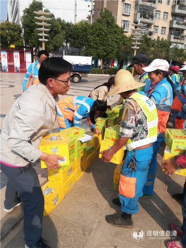 “与其他平原城市不同,昆明的紫外线特别强,同是30℃,昆明要比其他平原城市体感温度高得多。环卫工人们要一直在户外作业,有的保洁员胳膊都晒伤了;机扫车驾驶员在闷热的驾驶室里操作,都是满头大汗;帮助收垃圾的辅助工,更是辛苦,天气炎热垃圾易腐变质,但仍要保质保量的完成清运任务。公司领导看在眼里,记在心里,所以特购买了一批防暑降温的饮品,鼓舞大家的势气。”说到为什么要为工人们发放解暑降温的饮品,云南京环盘宸公司作业与安全部副部长艾传忠说道。