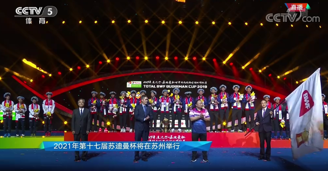 颁奖仪式结束后,苏州副市长王飏从中国羽协主席张军手中接过会旗,苏州正式成为2021年苏迪曼杯举办城市。