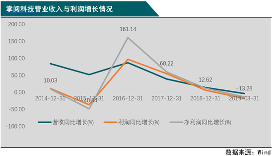 然而,上市不足2年,掌阅科技就已陷入增长困境之中。2018年年报显示,掌阅科技营业收入与净利润增速均出现大幅下滑;2019年第一季度下滑更为明显,数据显示2019年一季度掌阅科技营业收入同比下降3.64%,营业利润与净利润下降幅度更大,超过10%。