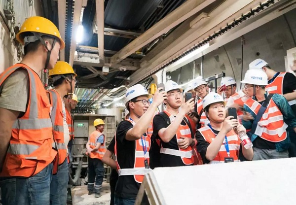 △小伙伴们走进中铁装备施工的隧道内,近距离观看正在施工中的盾构机