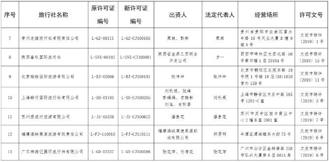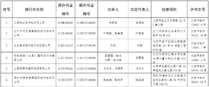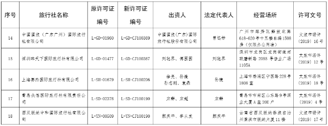 5月27日,文化和旅游部发布《关于许可旅行社经营出境游业务的公告》。公告显示,按照《旅行社条例》和《中国公民出国旅游管理办法》,许可以下18家旅行社经营出境游业务: 近年来,随着出境游市场的发展,旅游相关单位不断加强审批出境游业务。对旅游市场秩序的规范、监管力度也不断提升。数据显示,2016年,全国共吊销61家旅行社经营许可证,2018年,文旅部在为期3个月的全国旅游市场秩序整治中吊销了34家旅行社经营资质。今年,文旅部已发布过3次关于取消旅行社经营出境游和旅行社业务的公告,共取消了30家旅行社的出境游业务经营权、注销了11家旅行社的旅行社业务。(央广网 记者梁晨)