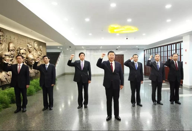 2017年10月31日,习近平带领其他中共中央政治局常委同志一起重温入党誓词。