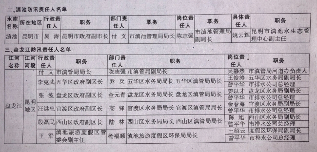 其中,昆明市主城区和滇池的防汛工作由昆明市政府副市长吴涛任行政责任人,昆明市水务局局长储汝明、副局长陈辉阳是,昆明市滇池管理局局长付文、副局长陈志强,昆明市排水公司总经理曾平华、副总经理赵思东,昆明市滇池水生态管理中心副主任姚云辉等人任部门责任人或岗位责任人。