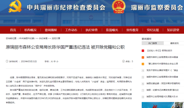 昆明信息港讯 据瑞丽市纪委监委5月30日消息,瑞丽市森林公安局原局长陈华国严重违纪违法被开除党籍和公职,涉嫌犯罪问题移送检察机关依法审查起诉。