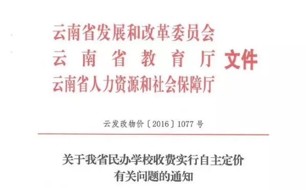 2016年,为落实中央及云南省政府相关文件精神,利用价格杠杆促进云南民办教育发展,云南省发展和改革委员会、云南省教育厅、云南省人力资源和社会保障厅发布了云发改物价〔2016〕1077号《关于我省民力学校收费实行自主定价》的通知。