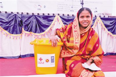 2018年2月,中国政府和联合国开发计划署向孟加拉国北部洪泛平原受洪灾影响的群众提供援助。图为领取救灾物资的当地民众。
