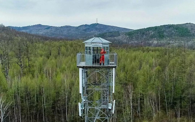 △5月11日,奇乾中队消防员在管护区瞭望塔上进行防火瞭望。