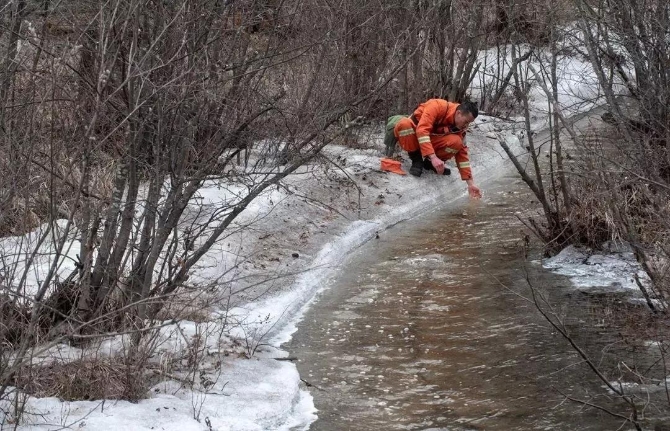 △5月10日,一名进山巡护的消防员在没有完全消融的溪水边休息。