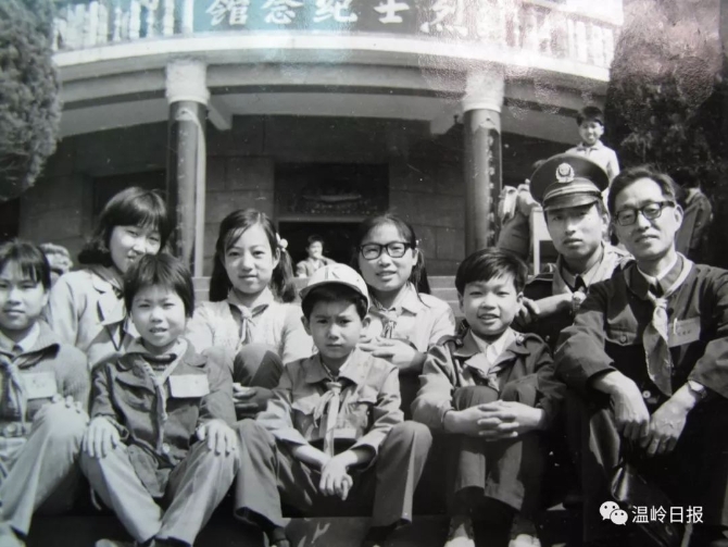1965年,俞明德与少先队员在一江山岛烈士纪念馆前合影留念。