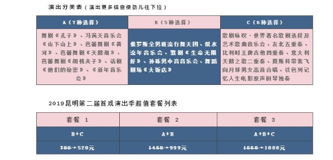 2019年的第二届首戏演出季推出超值套餐99套,售完即止。套餐内座席为每场演出的最高票价区域随机座席票一张。每人限购3套。具体套餐类型如下: