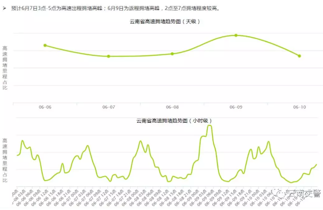高速公路拥堵趋势预计6月7日凌晨3点至5点为高速出程拥堵高峰;6月9日点为返程拥堵高峰,凌晨2点至7点拥堵程度较高。如图:
