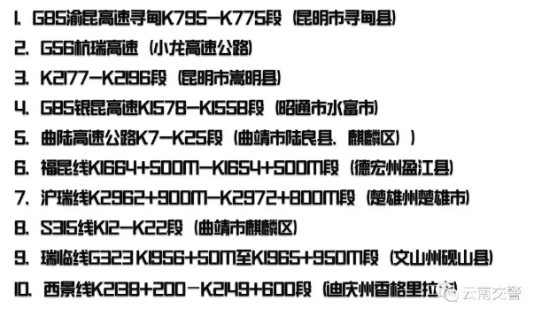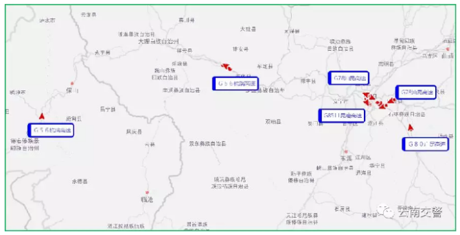 车辆途经渝昆高速水富-昆明路段、杭瑞高速富源-禄丰路段、昆磨高速昆明-元江路段、瑞临线文山州及红河州境内路段、秀河线红河州境内路段、京昆高速昆明-攀枝花路段、攀丽高速攀枝花-华坪路段时,需注意局部路段路面湿滑的不利影响。