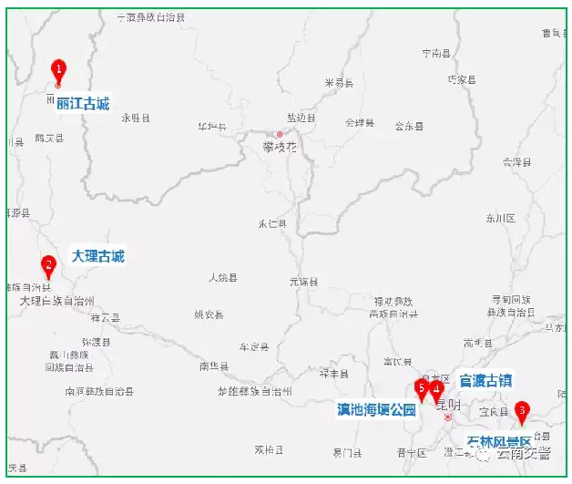 预计节日期间丽江古城最受欢迎,其次是大理古城、石林风景区、官渡古镇、滇池海埂公园。如图: