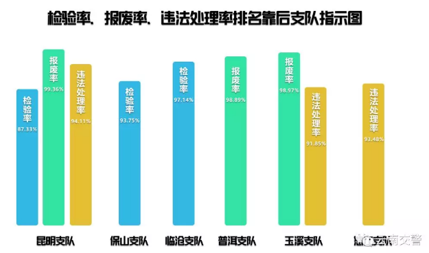 (一)“营转非”大客车、危险货物运输车、大型公路客车、大型旅游客车、校车五类重点车的检验率、报废率、违法处理率排名靠后情况,如下图: