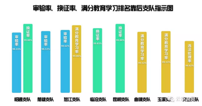 (三)重点驾驶人(A1证、A2证、B1证、B2证)审验率、换证率、满分教育学习率排名靠后情况,如下图: