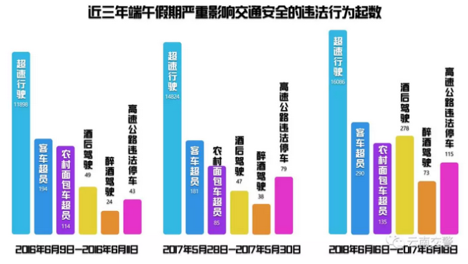 近3年端午小长假期间,严重影响交通安全的违法行为有超速行驶、客车超员、农村面包车超员、酒后驾驶、醉酒驾驶、高速公路违法停车,如下图:
