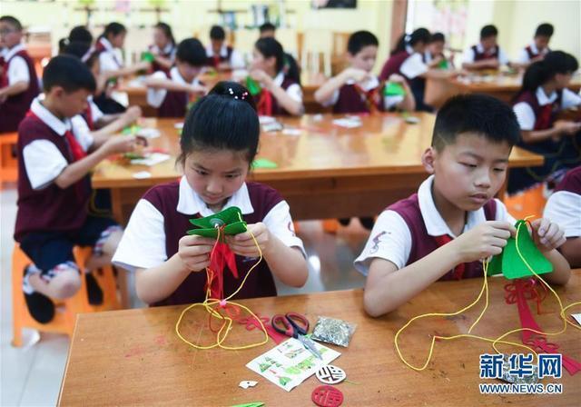 6月4日,洲泉镇洲泉实验小学的学生们在端午民俗课上学习香袋的制作。新华社记者 徐昱 摄