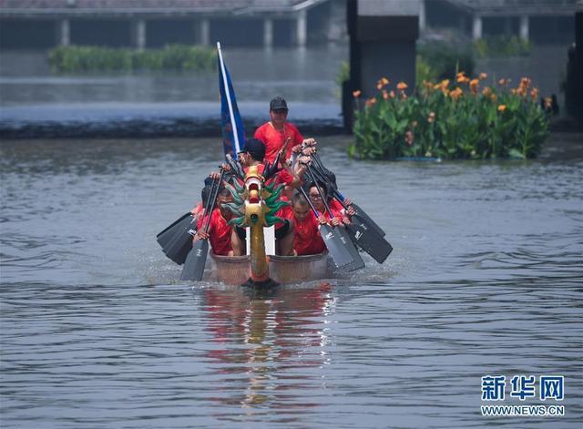 6月4日,桐乡市洲泉镇的龙舟队在湘溪公园旁的河道中开展训练,他们将代表桐乡参加2019嘉兴端午民俗文化节的龙舟竞渡(无人机拍摄)。新华社记者 徐昱 摄