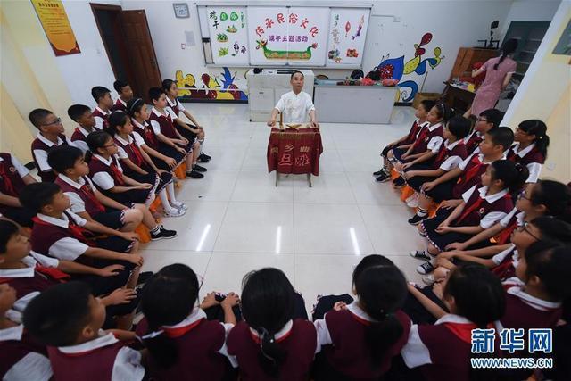 6月4日,洲泉镇洲泉实验小学的学生们在端午民俗课上听桐乡传统民间曲艺“三跳书”。新华社记者徐昱摄