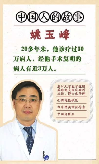 他就是姚玉峰,浙江大学医学院附属邵逸夫医院眼科主任、博士生导师,全国道德模范、白求恩奖章获得者、中国好医生。20多年来,他诊疗过30万病人,经他手术复明的病人有近3万人。