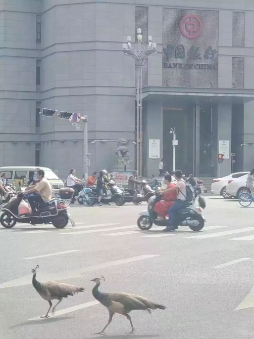 随后,记者来到人民中路,一位银行门口值班的保安告诉记者,他亲眼目睹了早上“孔雀排队逛街”的情景。