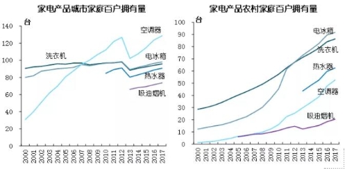 根据国家统计局的数据,中国城市家庭的冰箱、空调、洗衣机、吸油烟机、热水器普及率目前均已超过70%,其中,冰箱和洗衣机已接近饱和,空调正在向着一户多机的方向发展。虽然受城乡发展不平衡的影响,家电产品在农村家庭的普及率和城市家庭还存在差距,但随着国家城镇化的持续推进、居民可支配收入的增长和生活方式的变化,以及2008-2012年国家曾实施的家电下乡、以旧换新、节能惠民政策的助推,目前农村家庭的冰箱和洗衣机类产品普及率已经逐步接近城市家庭,不过空调、热水器、吸油烟机等产品普及率有待提升。