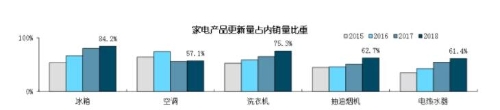 据测算,2018年冰箱、空调、洗衣机、吸油烟机、电热水器的更新量分别为3496万台、4863万台、3263万台、1317万台、1262万台,占2018年各自内销量的比重分别为84.2%、57.1%、75.3%、62.7%、61.4%,更新换代需求明显已经占据主导。另外,近三年看,这些产品的更新换代占比均在逐年提升。