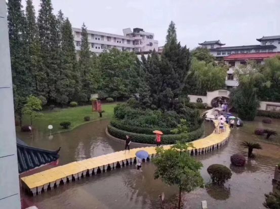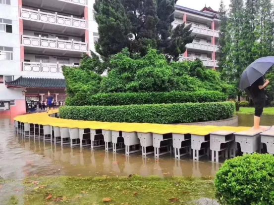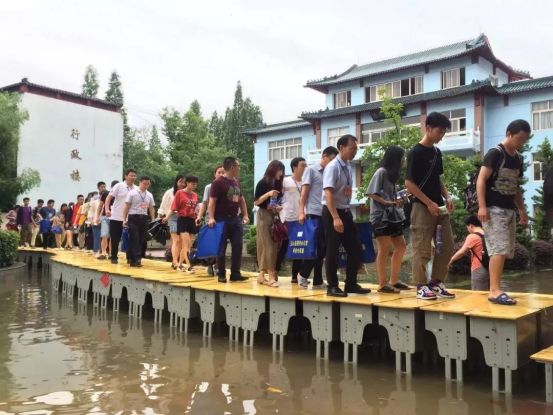 江西上饶暴雨考点被淹,老师用课桌为考生搭起“爱心桥”