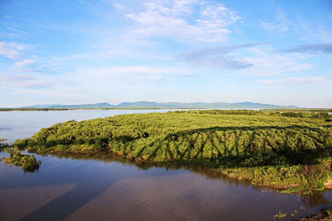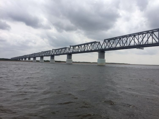 ▲中俄首座跨黑龙江铁路桥同江大桥横跨一个小岛。(6月4日摄)本报记者谢锐佳摄