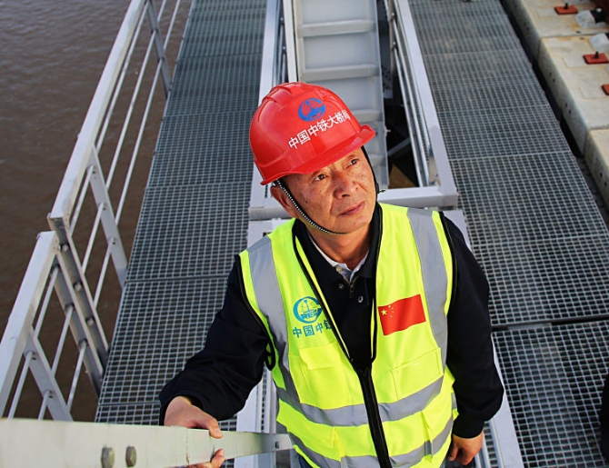 ▲中铁大桥局集团同江中俄铁路大桥项目经理部党工委书记林永汉在检视大桥。(6月4日摄)本报记者谢锐佳摄