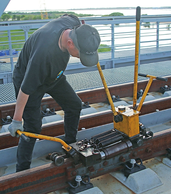 ▲中铁大桥局中俄同江铁路大桥项目的建设者正在对钢轨精度进行微调(6月4日摄)。本报记者谢锐佳摄