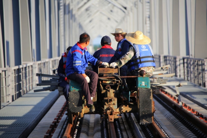 ▲中俄首座跨黑龙江铁路桥同江大桥桥面。据悉,按目前进度,中方一侧7月1日前具备开通条件。(6月4日摄)