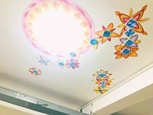 画完这棵大树,颜料还剩下不少。刘杨又动起了其他脑筋。“监区的设计有特殊性,长长的通道两旁都是铁栅栏封闭起来的监室。我就想怎么弄能让大家的心中多点色彩。”通道天花板上原本只有灯,以晕黄灯光的形状为基础,她设计出一朵朵五彩斑斓的花。“我从小的梦想就是在墙上画画,像米开朗基罗那样!我在家里墙上画没少被父母打,没想到工作竟让我‘正大光明’地实现了梦想!”